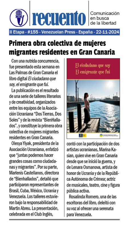 La publicación es el resultado de una serie de talleres literarios y de creatividad, organizados entre los equipos de la Asociación Ucraniana “Dos Tierras, Dos Soles” y de la revista “BienHallados”, y constituye la primera obra colectiva de mujeres migrantes residentes en Gran Canaria.
